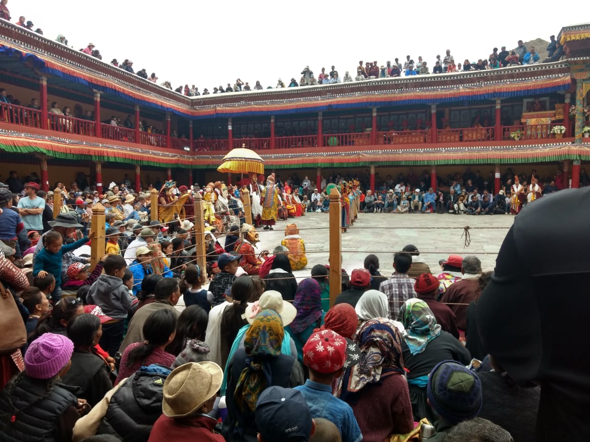 The Hemis Monastrey is tucked away in a hidden valley almost 40 km from main Leh city and is the most renowned and biggest monastery in Leh. The festival is conducted to honor the birth anniversary of Guru Padmasambhava aka Rinpoche. He is an Indian guru of the 8th century and is revered for spreading Buddhism throughout the Himalayas. Hemis has the largest silk embraided brocade or ‘thanka’ which is unfurled once in twelve years, in the year of the monkey. Unfortunately, we did not see that thanka, but we saw another brocade. There is a large statue dedicated to Rinpoche surrounded by prayer rooms.