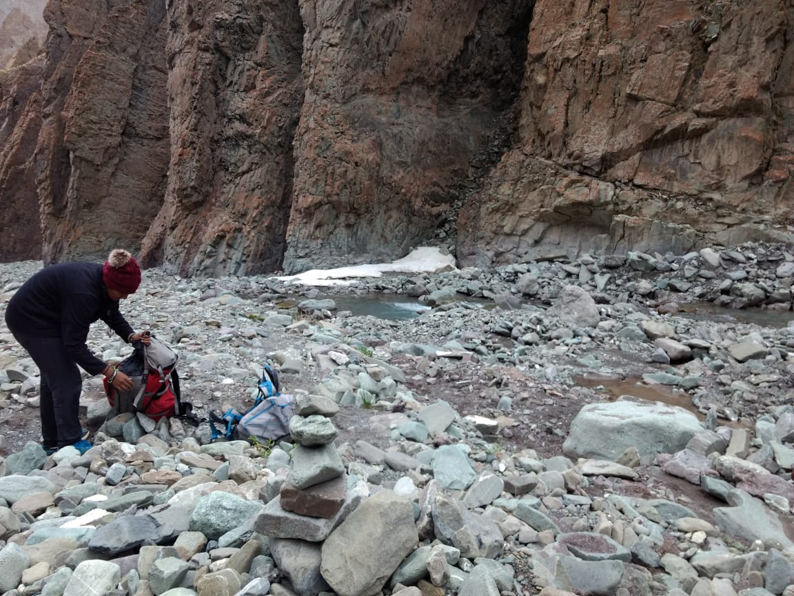 As we walked through the valley, we saw a natural water purifier. Water directly from the glacier had reached this valley, and it was filtered by sand and stones on the way. It was extremely clean and we had no problem drinking it.  We even filled a plastic bottle with its water and wrote with marker “Bottled at 15f000ft”. Now comes the exciting part.
