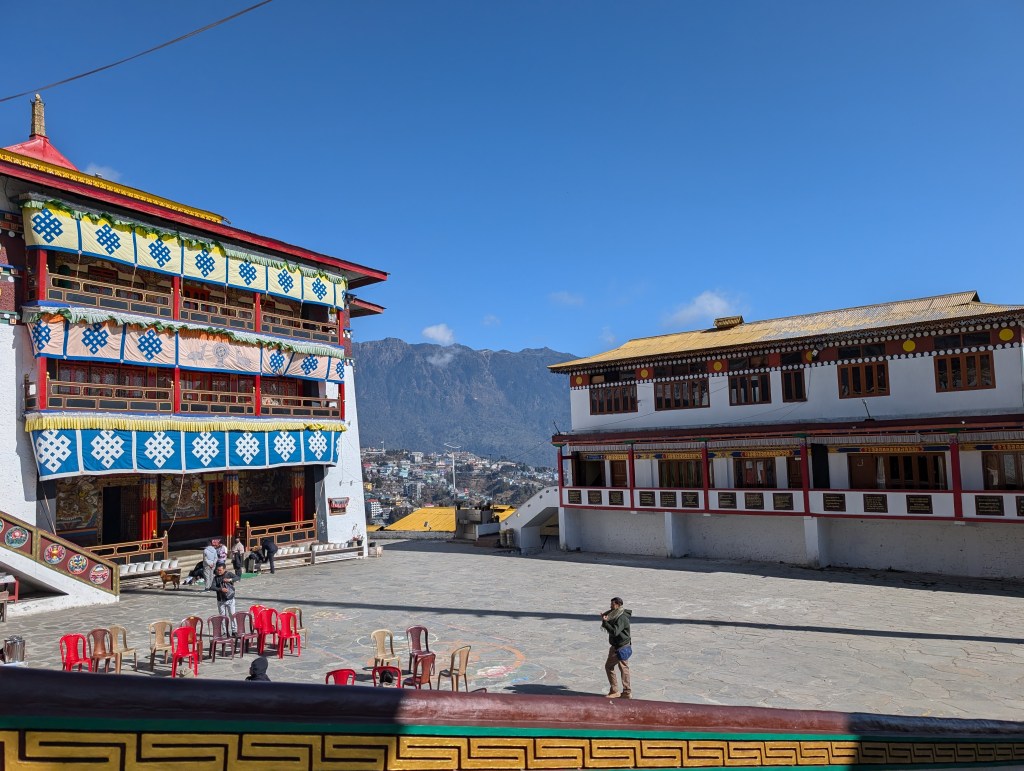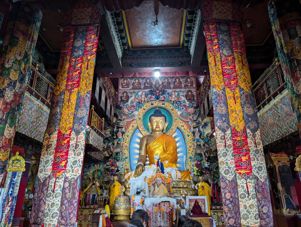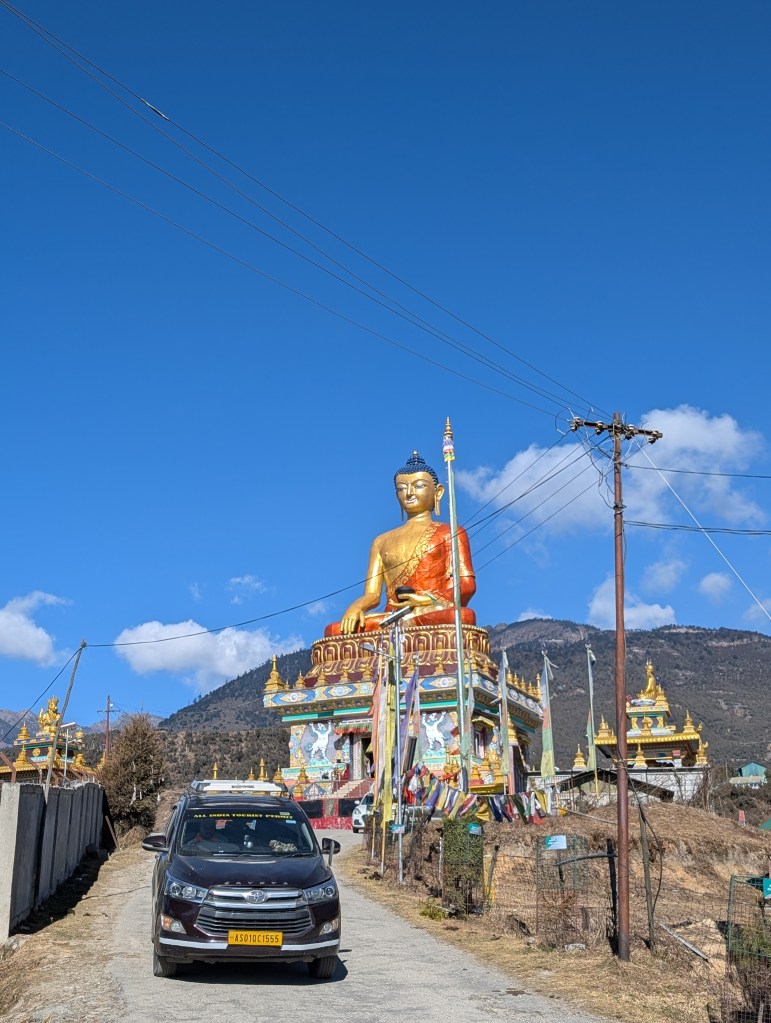 It was truly remarkable to see the different types and sizes of monasteries. Smaller towns (indeed, villages like Shergaon and Chug (Dirang)) that we visited had small but intricate monasteries; they also seemed to serve a town hall/community gathering purpose for these areas. Larger cities like Tawang had multiple elaborate monasteries with different purposes – some were nunneries, even some community parks. The Dirang monastery, perched atop a hill overlooking the river, was surprisingly expansive, and clearly the most expensive (though someone forgot to pay the contractor to make straight, consistent steps, ending up in a sloped fiasco that saw many twisted ankles). They all shared similar interiors – a picture of the Dalai Lama sat upon a pedestal in front of a golden incarnation of Buddha, colourful ceiling and hanging lanterns, red and yellow walls adorned with different visuals – some had portraits of all the Lamas, some pictures of the Four Sights, and some just had names of donors! The elaborate monasteries were perched on a hill and boasted a large Buddha statue on its roof, always facing east, and almost always overlooking the vast valley. The smaller, community monasteries were built wherever one found space, considering as many religious stipulations as possible.