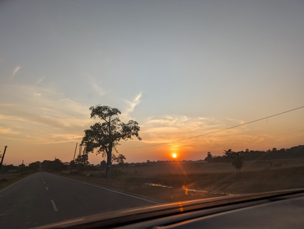 But the views didn’t stop when we sped downhill on day 8! The plains of Assam continued to deliver the most expansive horizons I’ve ever seen. Our single lane highway cut through farmland and densely packed trees on the edges of Assam’s abundant national forests. We’d sometimes be joined by picturesque single-track railway lines on our left as the greenery of pruned tea estates greeted us to our right. When the dark red sun set in the distance and dusk had its moment (albeit at 415pm), faint sunlight filtered through dusty horizons and covered my coveted mountains in a bit of a haze. Just serenity.