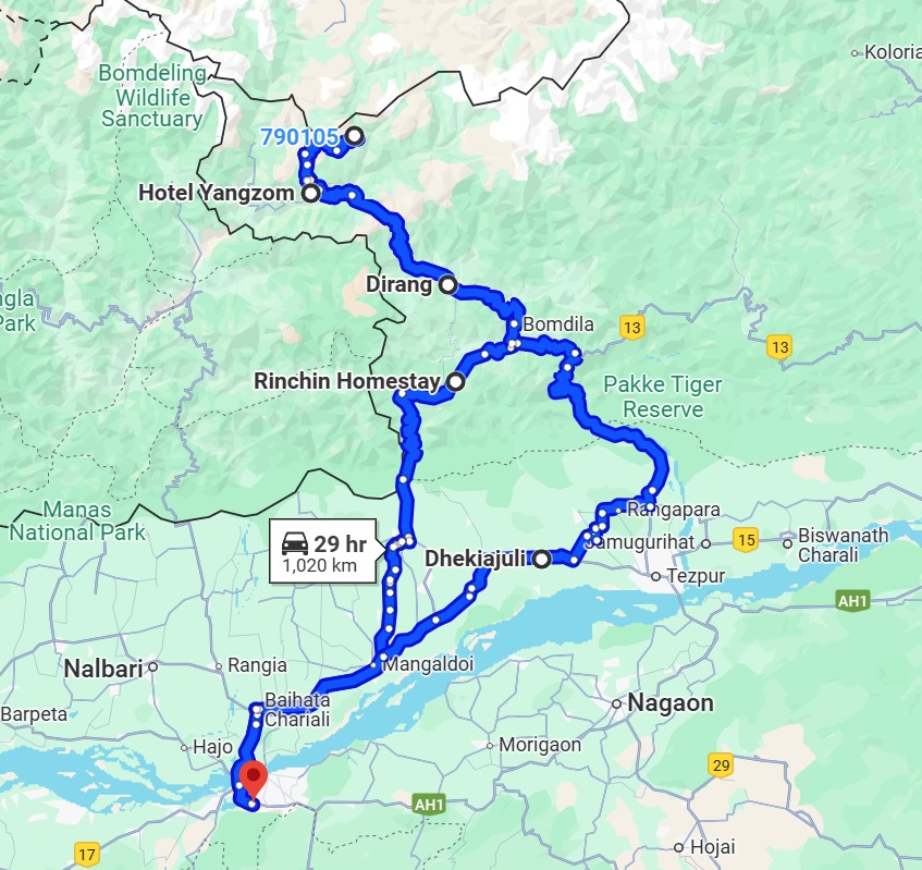Just so we have a timeline in place, we began our trip from Guwahati Airport (GAU, Assam) on the 27th of December, 2024, and stayed nights in Arunachal Pradesh’s Shergaon, Tawang, and Dirang, and a night each in Assam’s Dekhiajuli and Guwahati before returning on the 5th of January, 2025. Here’s a map of the region that I pulled from the Internet alongside a route map I made.